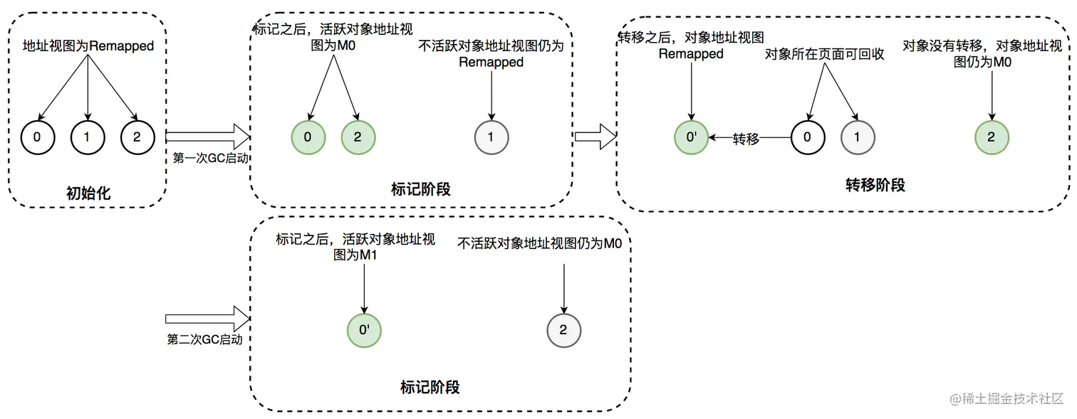 其实,在标记阶段存在两个地址视图 M0 和 M1,上面的过程显示只用了一个地址视图。之所以设计成两个,是为了区别前一次标记和当前标记。也即,第二次进入并发标记阶段后,地址视图调整为 M1,而非 M0。