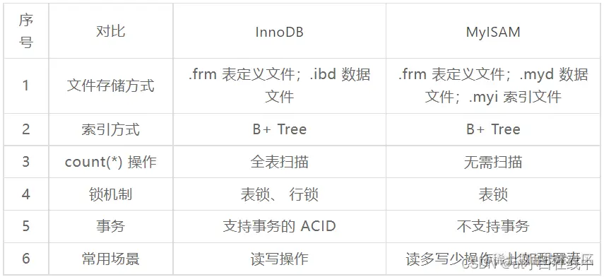 MyISAM 与 InnoDB 引擎主要有以下 6个方面的区别: