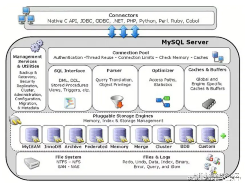 从以上的架构图我们可以看出,最上面的 Connectors 表示客户端,客户端就是一些具体的链接协议;下面的 MySQL Server 表示服务端,**前端培训**其中包括 Connection Pool 、SQL Interface、Parser、Optimizer、Storage Engines、文件系统(Files、Logs)以及管理服务。