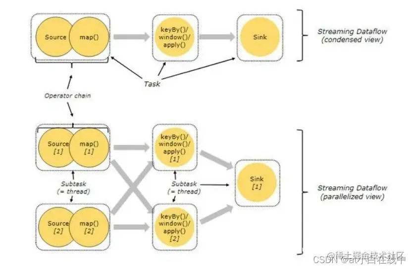 为了描述数据处理,Flink在数据流上使用操作符,每个操作符生成一个新的数据流。在运营商、DAGs和上下游运营商链方面,整个模型与Spark模型大致相同。Flink的顶点与Spark中的阶段大致相同,将操作符划分为顶点与上图中Spark DAG中的划分阶段基本相同。