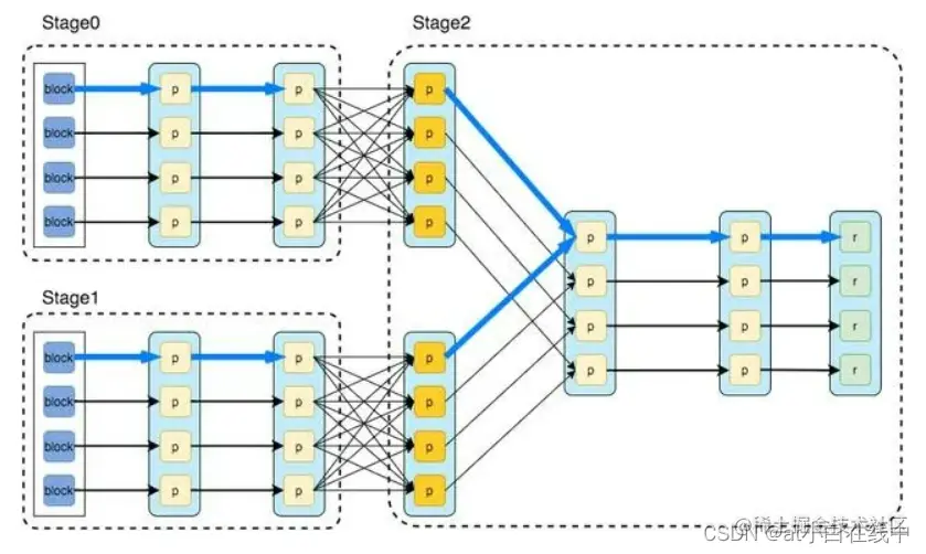 Spark和Flink在DAG执行方面有一个显著的区别。在Flink的流执行模式中,在一个节点上处理后的事件输出可以发送到下一个节点进行立即处理。这样执行引擎就不会引入任何额外的延迟。相应地,所有节点需要同时运行。相反,Spark的微批处理执行与正常的批处理执行没有区别,只有在上游阶段完成微批处理后,下游阶段才开始处理其输出。
