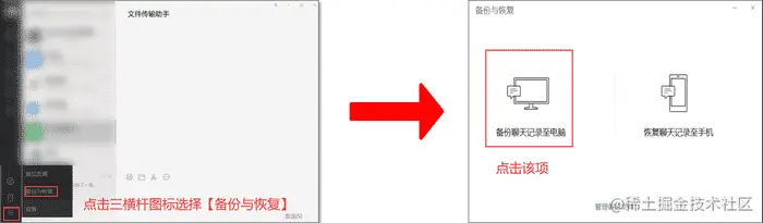 第2步:来到电脑微信界面,我们可以看到左下角有一个三横杆的图标,点击它后在选项里再点击【备份与恢复】,接着会弹出一个备份与恢复的界面。我们选择【备份聊天记录至电脑】,随后选择自己需要备份的聊天记录即可开始备份,备份时间以实际情况为准(聊天记录的大小、数量等因素)。备份过程建议不要随意中断,避免聊天记录里的文件损坏。注意:备份前提条件是电脑与手机连接在同一个无线网络下。