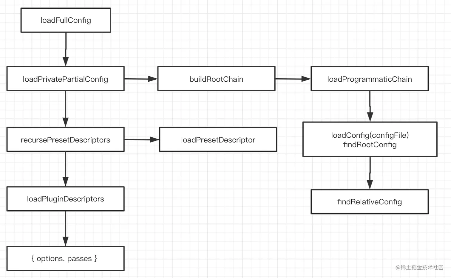 先看下Babel加载配置的流程图,Babel对配置的处理有些复杂,我们边看源码边梳理下。