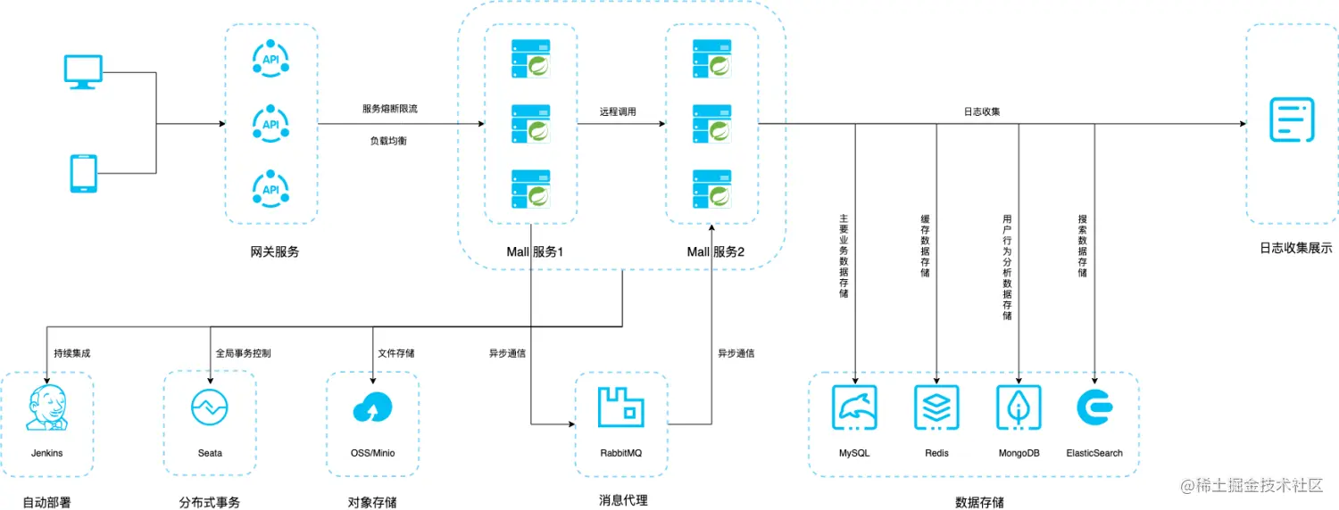 Mall 的架构如下图所示,分为网关层,应用层,数据存储层。请求首先通过网关到达 Spring Boot 应用服务。网关实现负载均衡,流量控制等功能。应用层包含 3 个 Spring Boot 应用和1个前端应用: