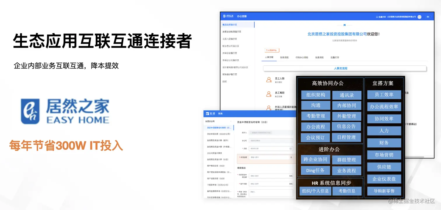 **生态应用互联互通连接者:**钉钉宜搭的标杆用户居然之家,使用钉钉宜搭搭建了400多个应用/流程,打通财务系统、采购系统、ERP系统,效率提升60%以上,直接节省上千万的费用。