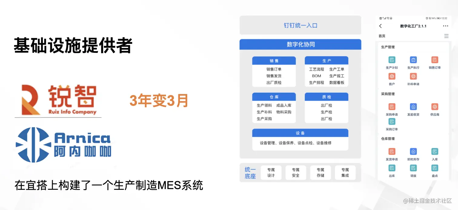 **基础设施提供者:**上海锐智使用钉钉宜搭建设了MES系统,过去传统全代码方式下需要3年时间,使用低代码只需要3个月时间。为制造行业建设数字工厂、实现柔性制造指明了出路。