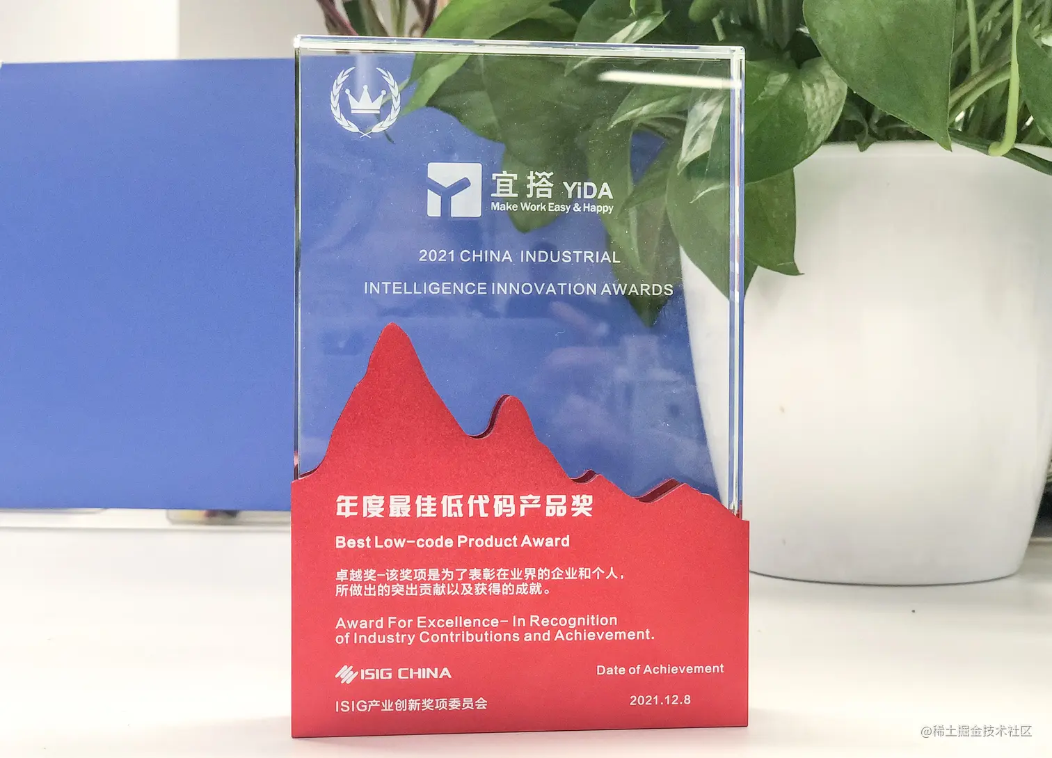 在这次低代码行业盛会上,钉钉宜搭也被评委会评选为**“年度最佳低代码产品”**。