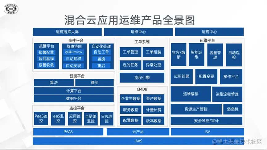 同时呈现了当下阿里巴巴运维的发展历程,以及各阶段面临挑战和对应产品实践,从统一CMDB、混合云应用管理平台到运维服务目录化,从智能化运维、无人值守、智能监控到混合云应用运维产品全景图等。