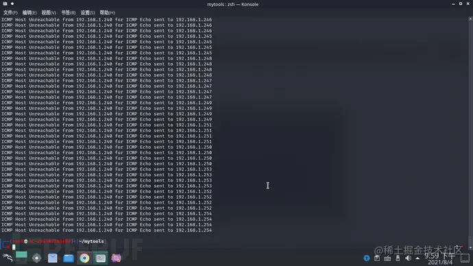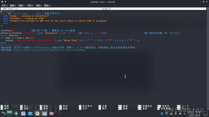 接下来我们需要对局域网下的所有存活主机进行扫描,我这里使用fping进行扫描,你们也可以通过其他工具来发现存活主机。比如你nmap啊或者arping啊等等去扫描。当然arping只能一个一个的扫描,非常麻烦,我呢也给大家弄了一个arping的脚本,大家可以参考图片。如果你不知道上述脚本怎么使用,欢迎在评论区提问,当然我本人建议你用一下方法去发现存活主机。
