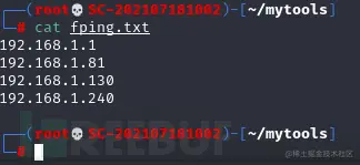 fping -g -a 192.168.1.0/24 > fping.txt 这句命令的作用是扫描192.168.1.1-254 并将存活主机ip记录到本目录下的fping.txt文件中,看下列实际操作图:ok,接下来扫描完成后cat查看一下我们的fping.txt记录了哪些存活主机。