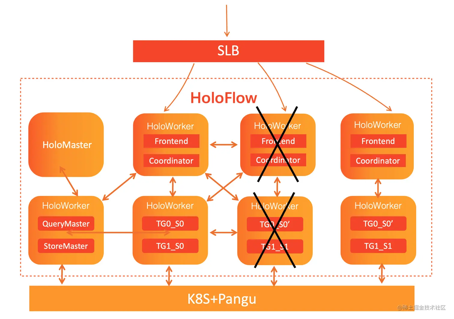 一个Hologres实例有多个HoloWorker,当某一个HoloWorker发生意外、宕机、failover时,通过Hologres的调度系统,可以快速检测到节点异常,并将异常节点的Service如Frontend、Coordinator、Shard快速调度到另外一个健康的HoloWorker,同时SLB将会将流量导流到新的健康Frontend上。
