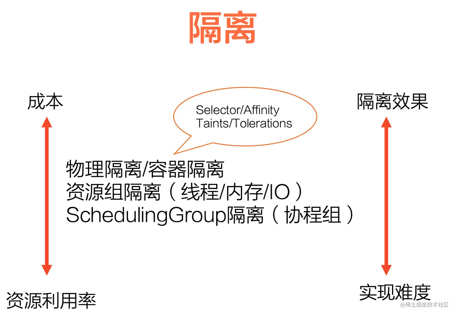 以上描述的场景都是隔离的范畴,相对来说隔离级别越高,成本越大,资源利用率越低。在进程内部实现低成本可用的隔离是一个很有技术挑战的事情。
