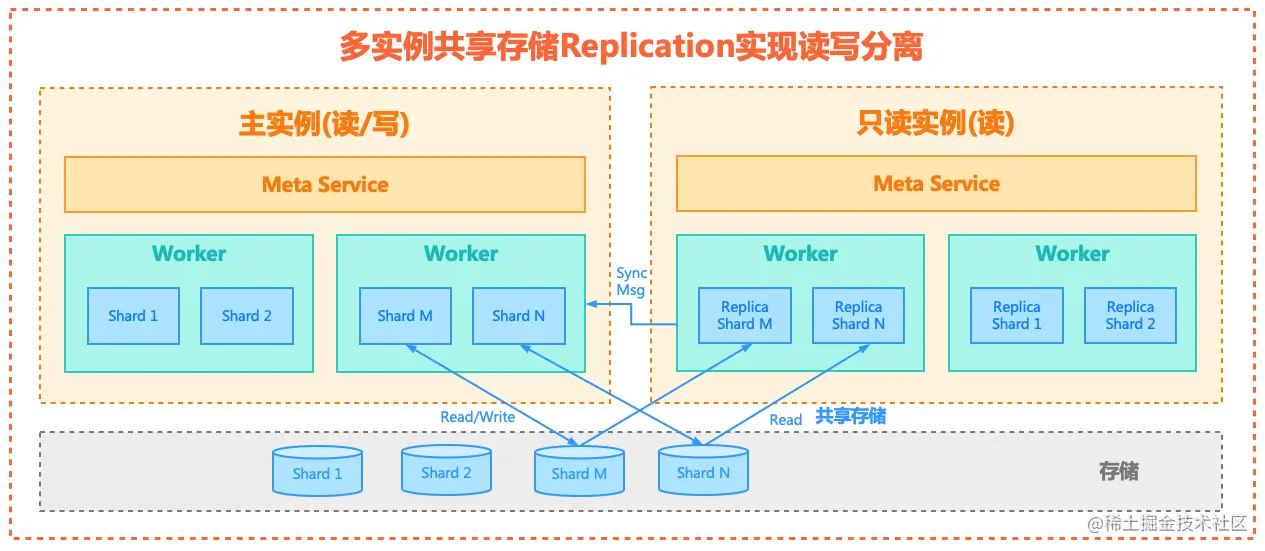 Hologres 在V1.1版本,支持了共享存储的多实例部署方案。在该方案中,主实例具备完整能力,数据可读可写,权限、系统参数可配置,而子实例处于只读状态,所有的变更都通过主实例完成,实例之间共享一份数据存储,实例间数据异步实时同步。