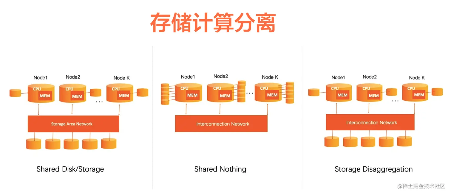 - Storage Disaggregation(存储计算分离架构):存储和Shared Storage类似,有一个分布式的共享存储集群,计算层处理数据的模式和Shared Nothing类似,数据是分片的,每个shard只处理自己所在分片的数据,每个计算节点还可以有本地缓存。