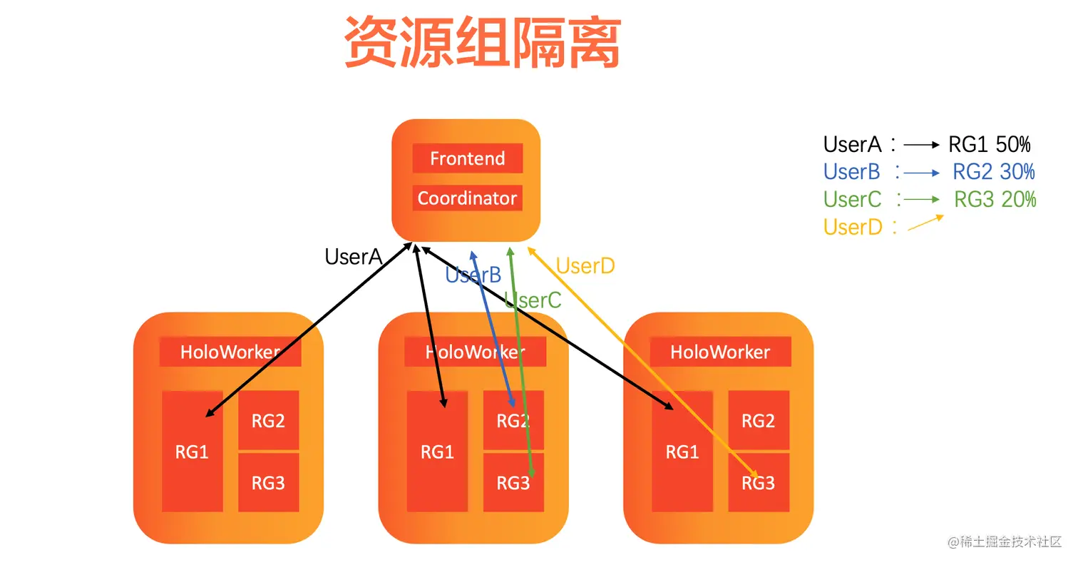 例如资源组(1)有50%的资源,资源组(2)有30%的资源,资源组(3)有20%的资源。我们把用户A绑定的资源组(一)上,用户B绑定在资源组(2)上,用户C和D绑定到资源组(3)上。这样用户A,B.C发起的请求就会分别调度到不同的资源组。
