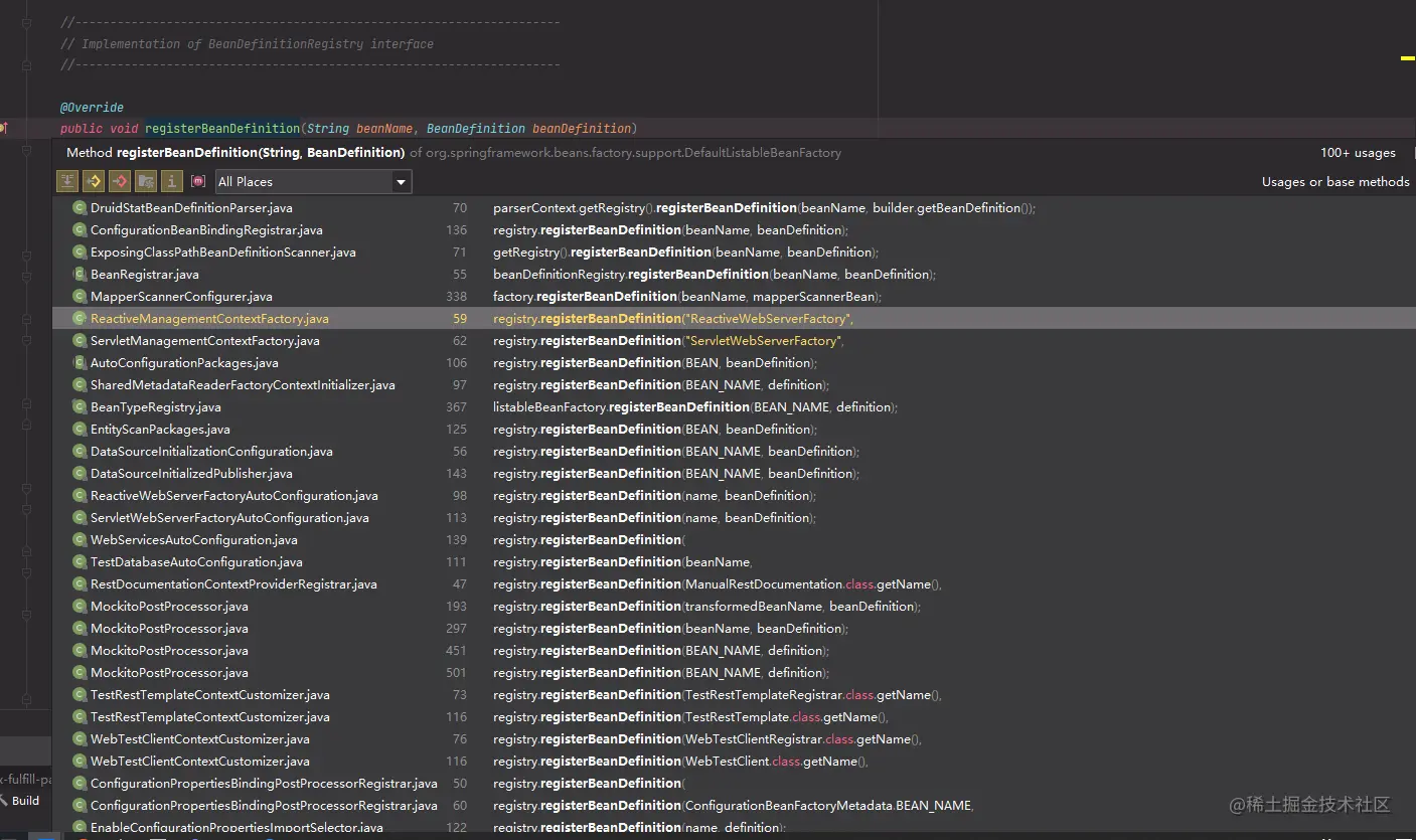 看源码中registerBeanDefinition的调用方很多,但是很多并不是直接关系bean的生命周期,因此主要关注bean生命周期的调用的话,主要涉及的是org.springframework.beans.factory.support.BeanDefinitionReaderUtils#registerBeanDefinition