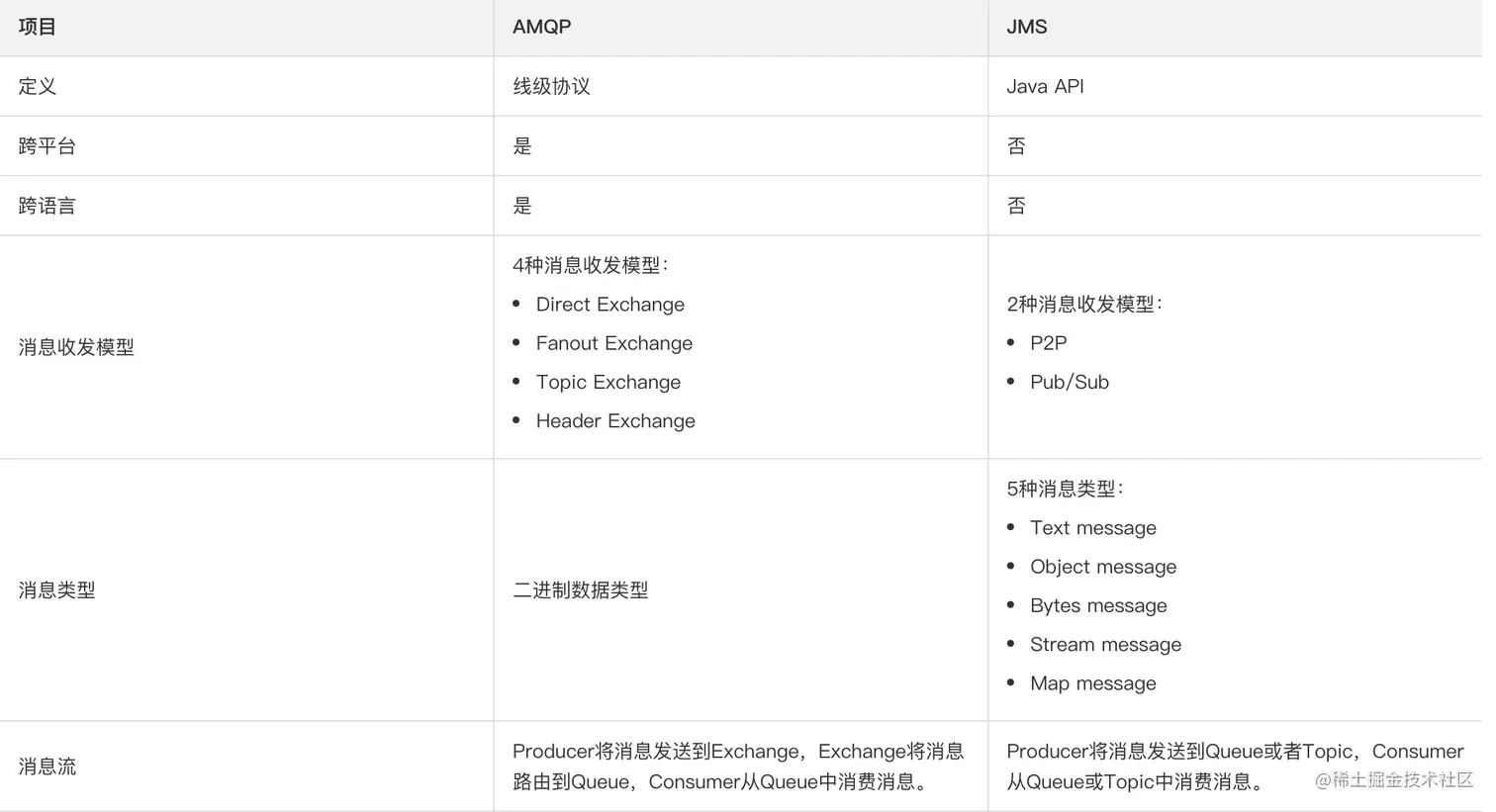 对于我们 Java 工程师而言,大家日常接触较多的应该是 JMS 和 AMQP 协议,既然 JMS 和 AMQP 都是协议,那么两者有什么区别呢?来看下面一张图: