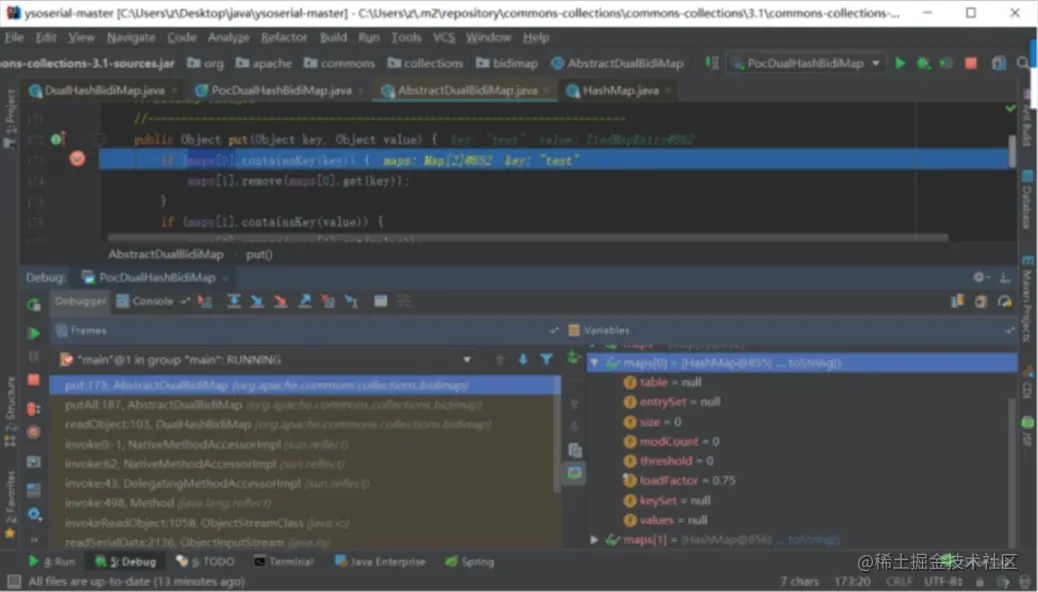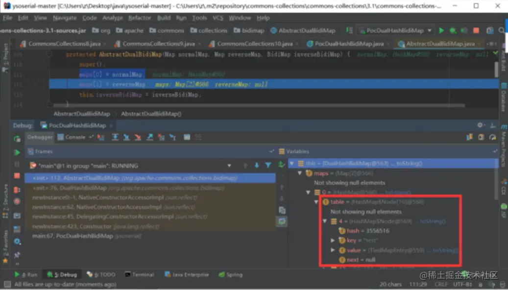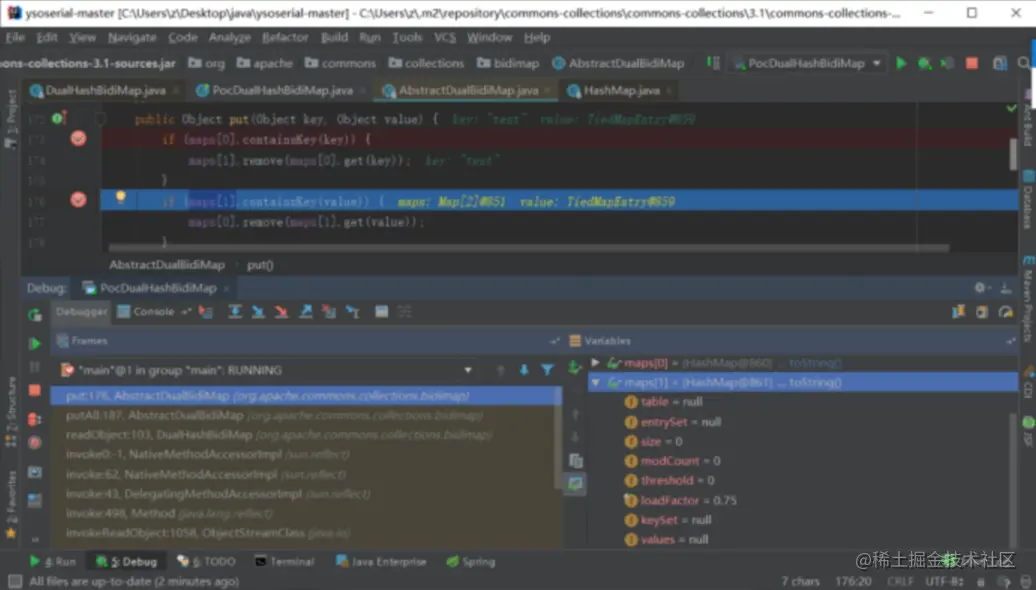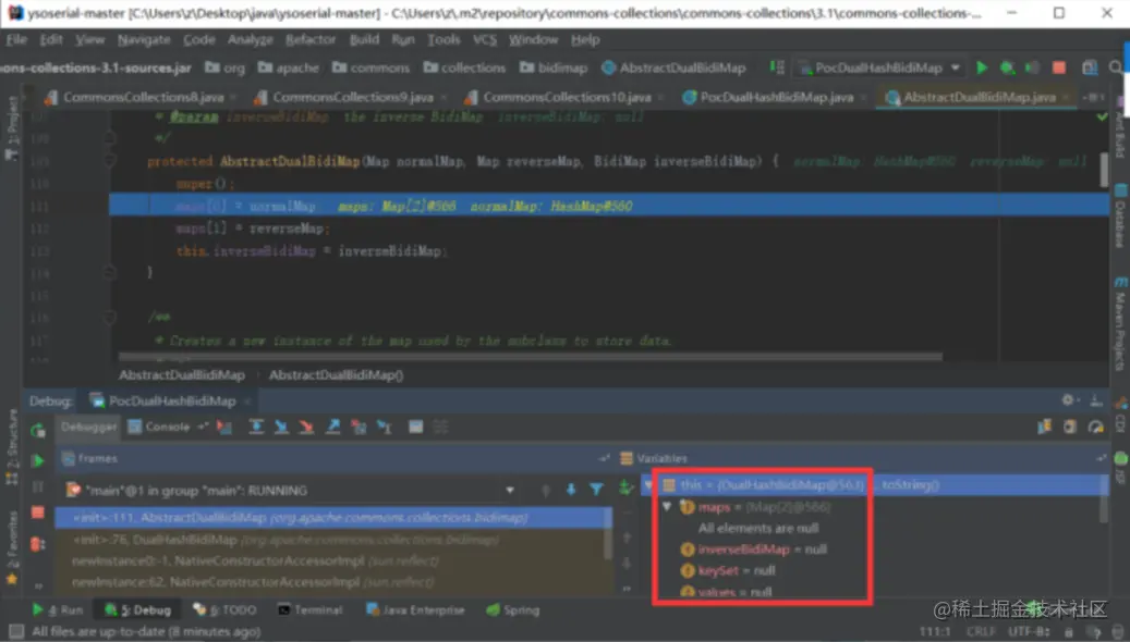 这句后,反序列化之后的DualHashBidiMap对象的maps[0]和maps[1]属性还是空的HashMap对象,没有改变: