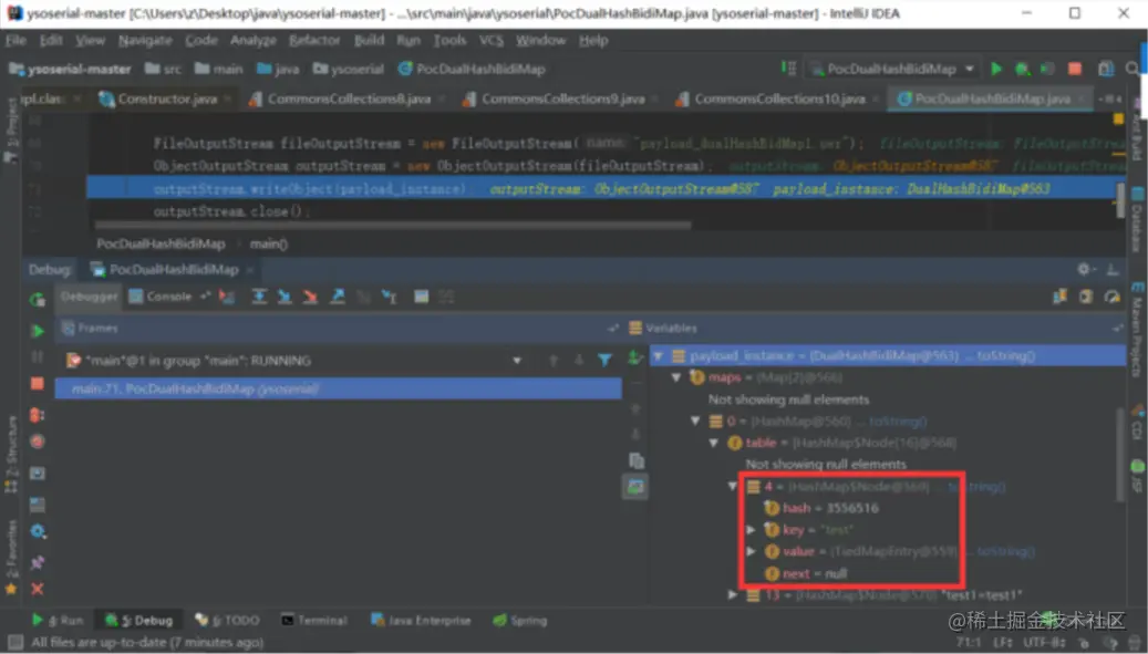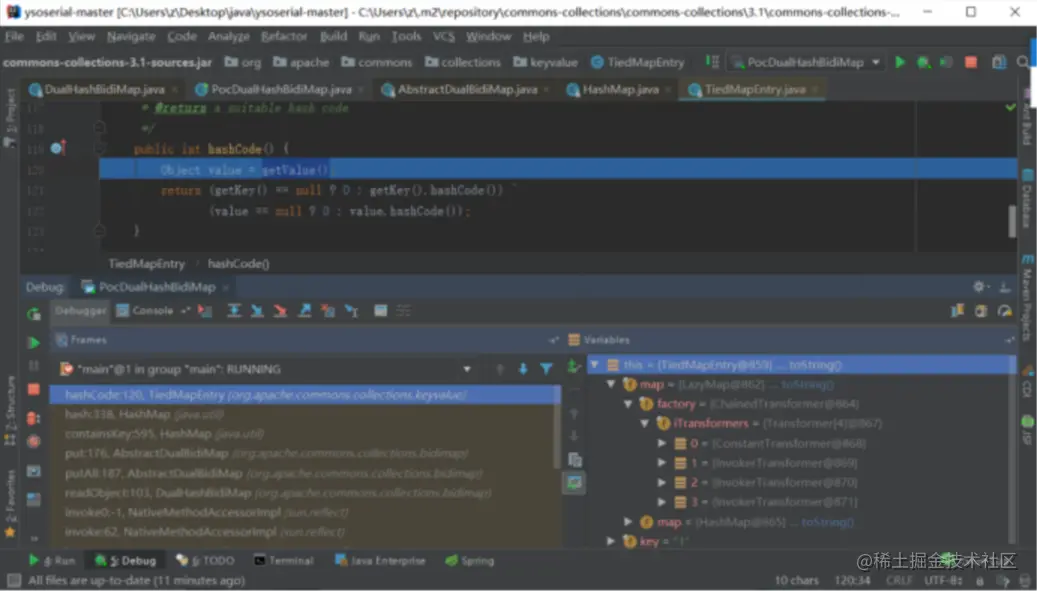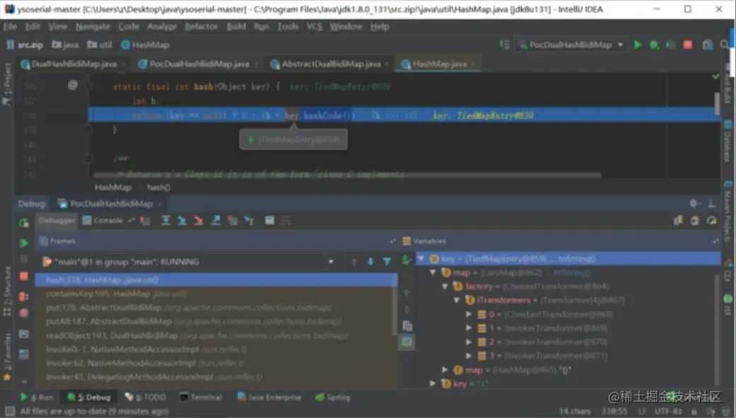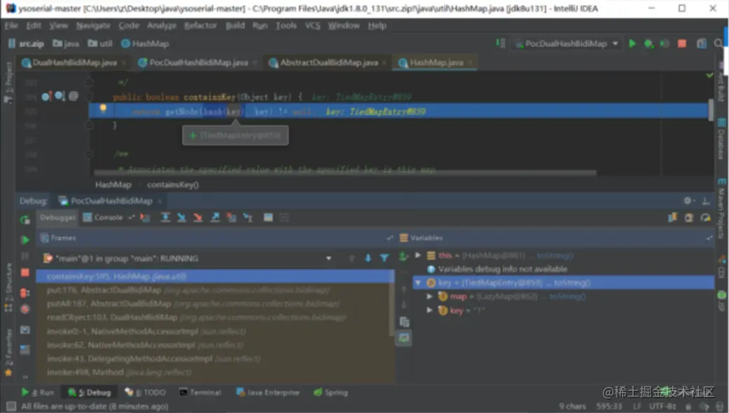 我们上边构造的DualHashBidiMap对象的maps[0]属性(我们构造的HashMap对象)的其中一个HashMap$Node对象的值就是恶意TiedMapEntry对象。