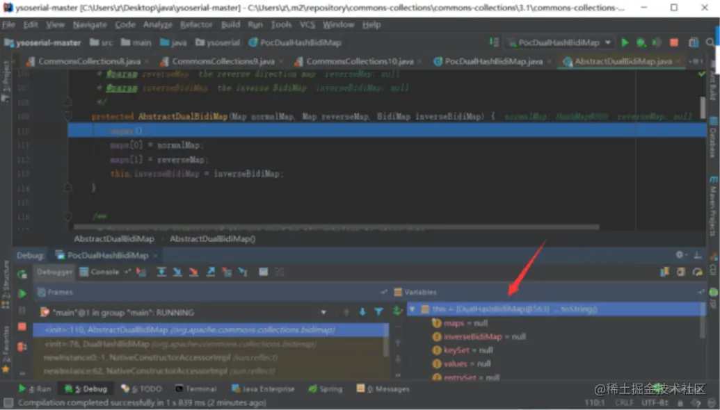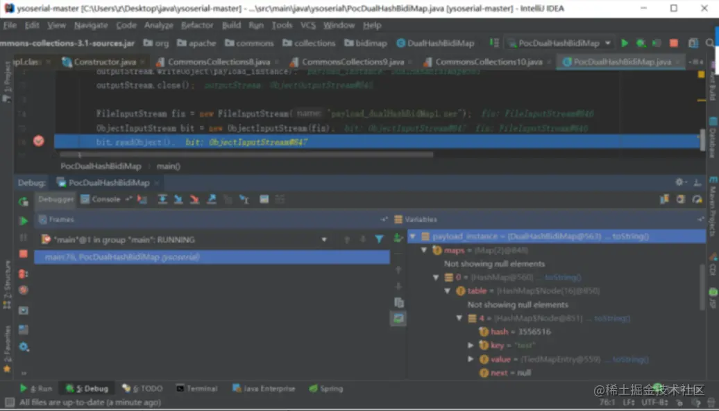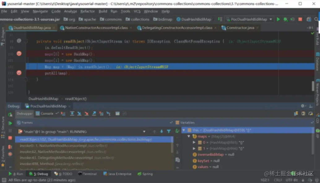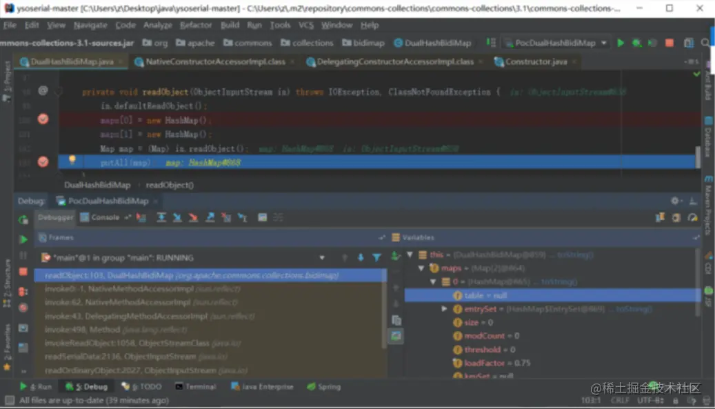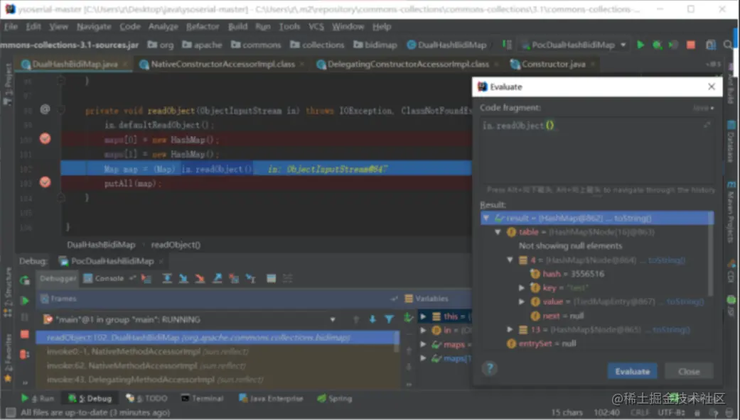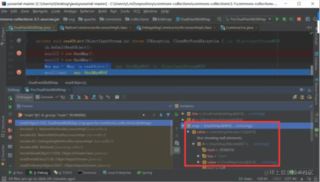 调试发现,DualHashBidiMap的自实现的 readObject() 中的
