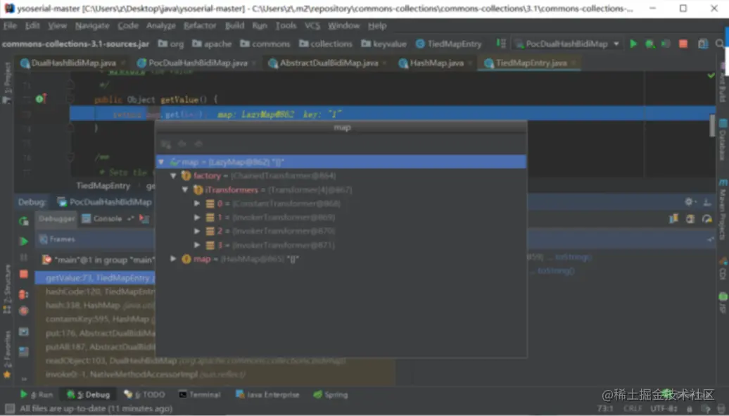 maps[0]和maps[1]都为刚才readObject方法中赋值的空的HashMap对象,这也就是前边说的,为什么不可利用LazyMap.get()
