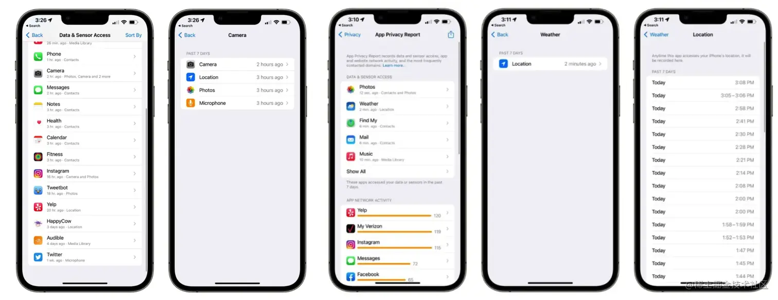 苹果在 iOS 15.2 测试版中引入了应用隐私报告,向用户提供应用访问通过隐私权限获取敏感信息(例如位置、联系人、相机、麦克风和照片)的频率的信息,还会显示网络活动,让用户知道应用程序在后台访问了哪些域名。拍手叫好>>