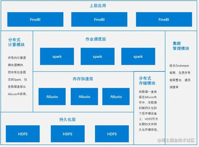 观远也是最近比较火的商业BI工具,其技术架构如下图所示。和帆软差不多,也具有直连和抽取两种模式,均基于spark计算,缓存用的是Cassandra。和帆软不同的是,为加速查询,观远尝试引入了Clickhouse,并且增加了AI方面的功能。