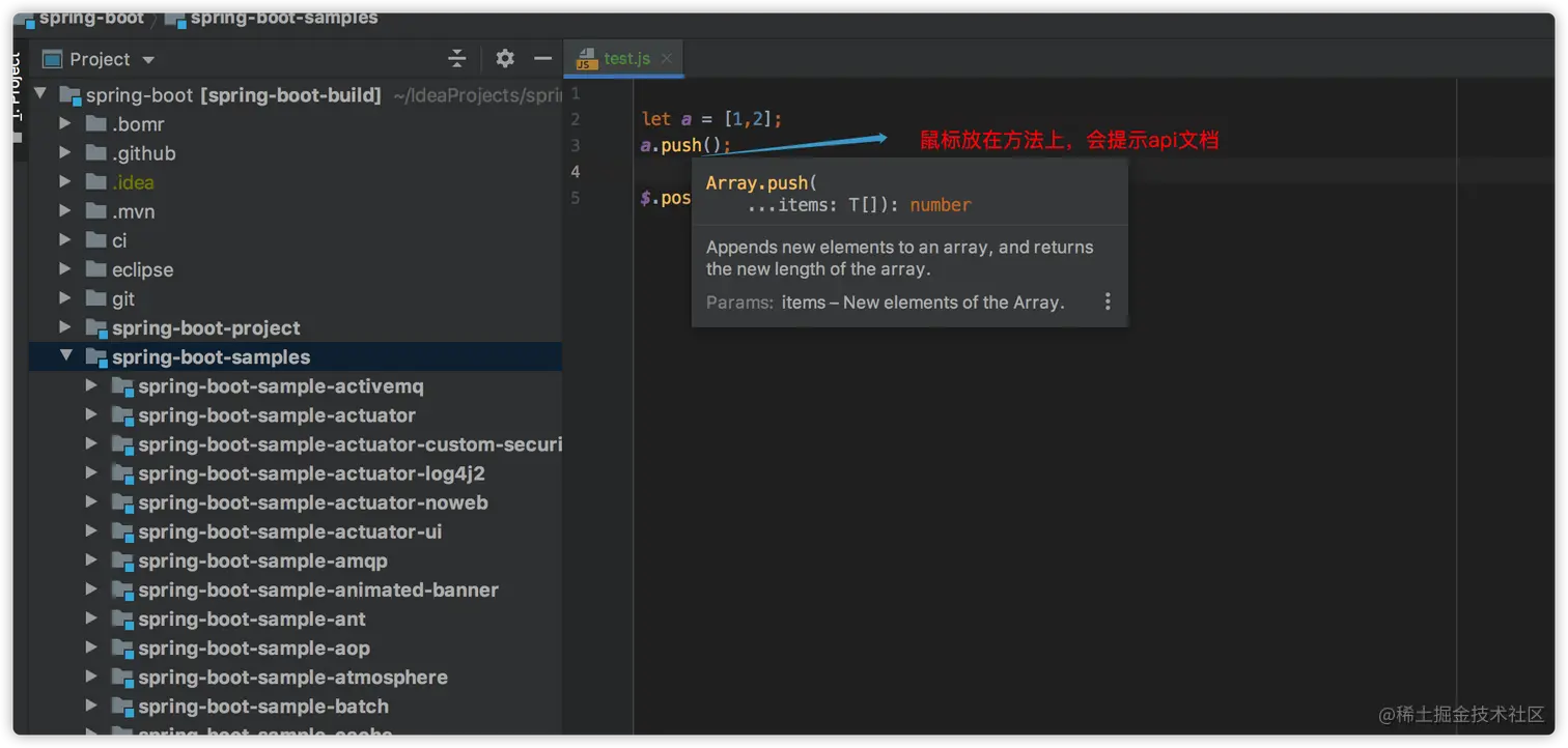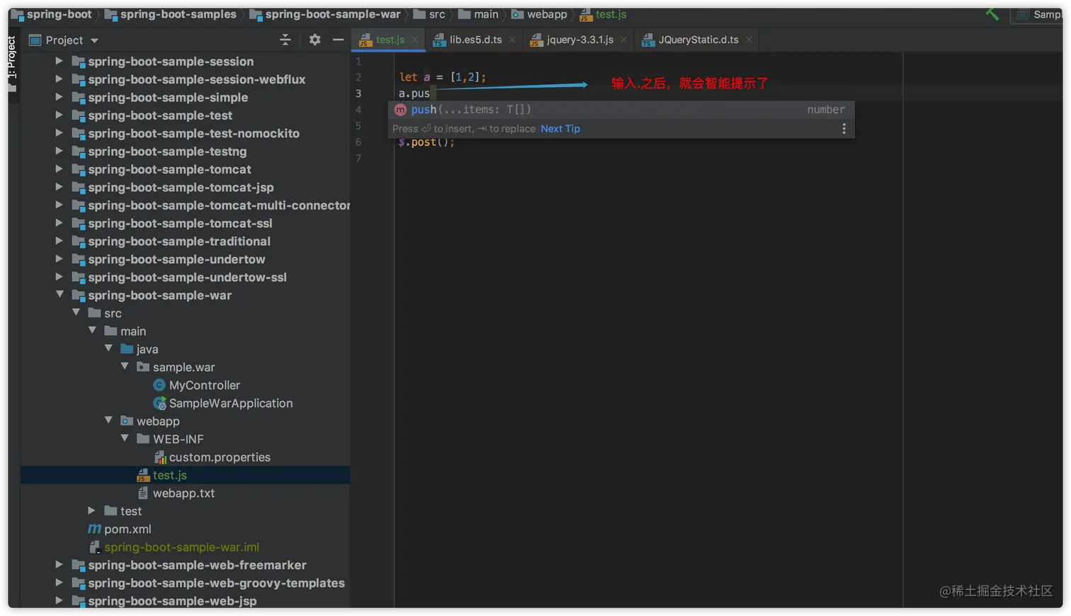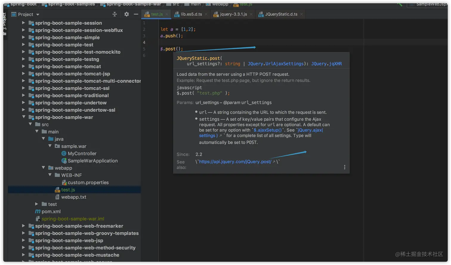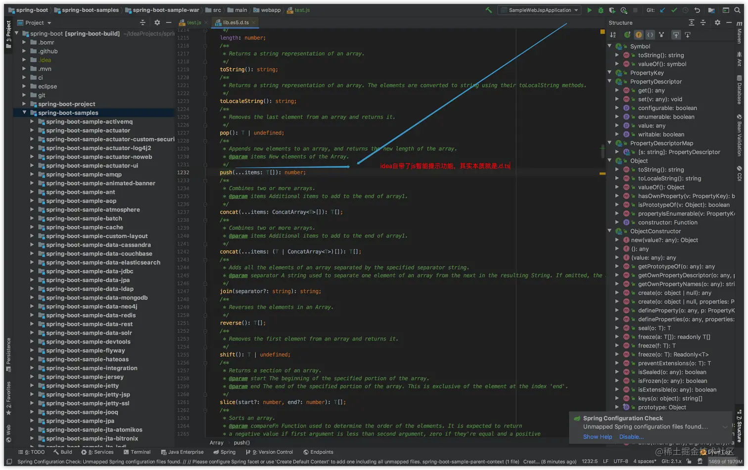 进入到方法里面,可以看到其实就是.d.ts文件起作用——idea自带了js只能提示功能。
