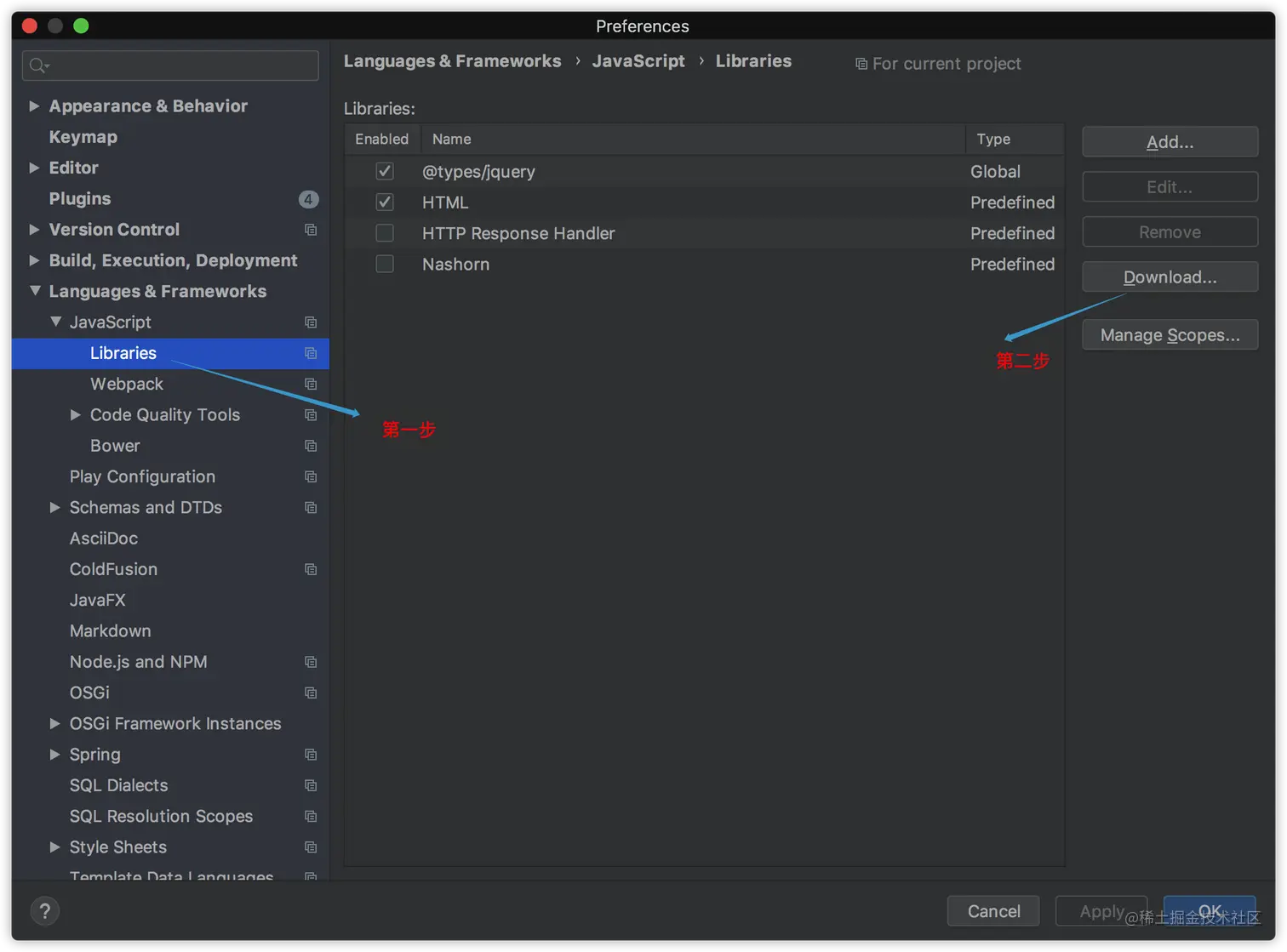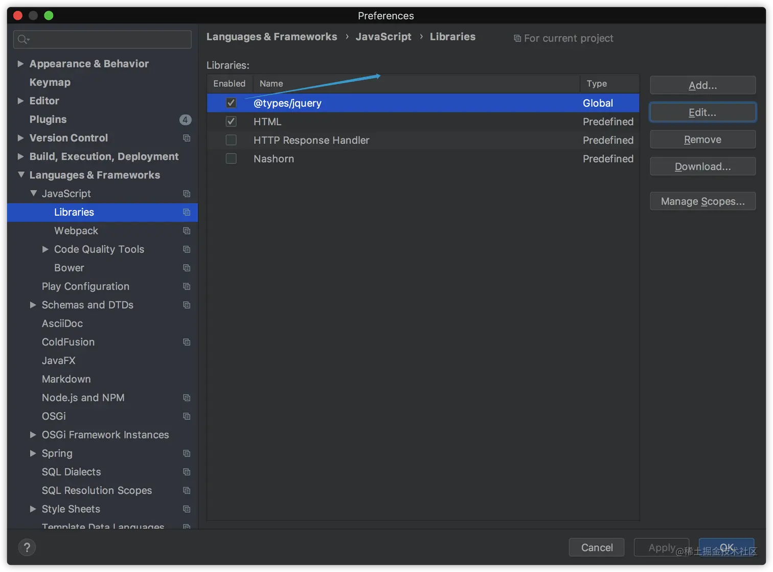 下载和安装成功,并且生效之后,这里会显示安装的js库