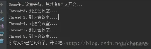 示例仍然使用开会案例。老板进入会议室等待5个人全部到达会议室才会开会。所以这里有两个线程老板等待开会线程、员工到达会议室: