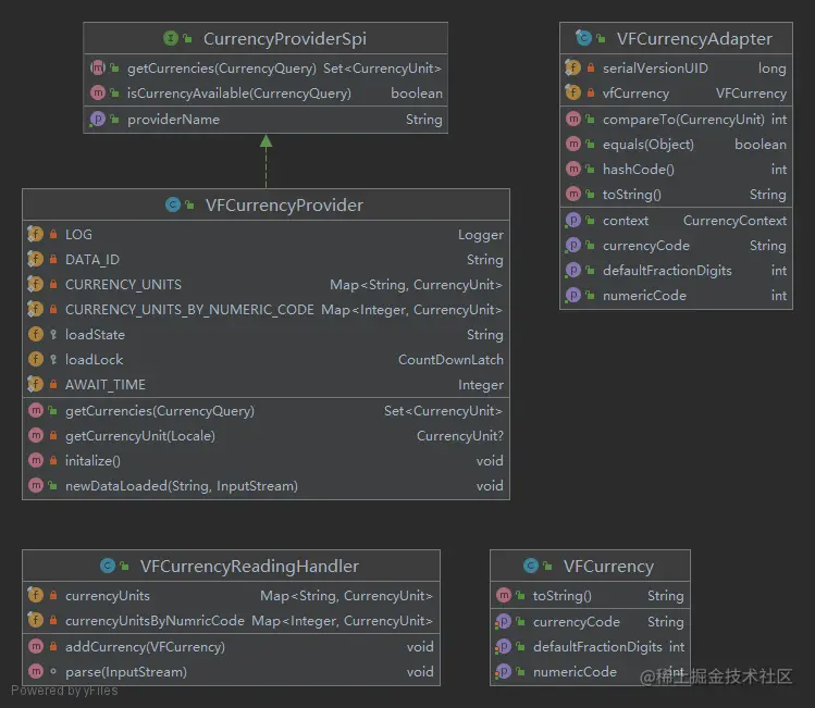 CurrencyProviderSpi和LoaderService.LoaderListener,用于扩展货币类型和实现扩展的货币类型的数据加载。其中包含的数据解析类VFCurrencyReadingHandler,数据模型类VFCurrency等代码省略。对应的实现关联类图为;