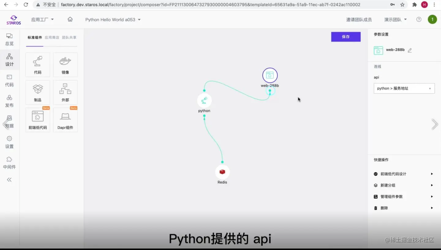 代码组件编辑完毕之后,就可以拉动连线将Redis和代码组件连接起来,然后点击保存。