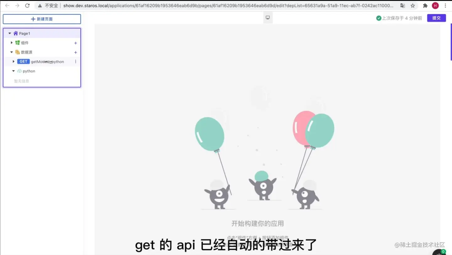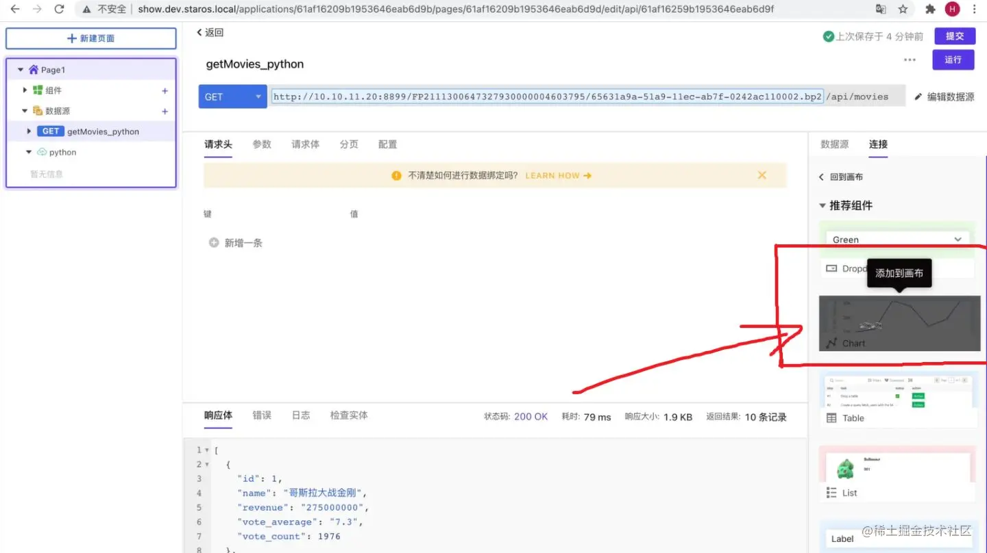 然后,点击界面右侧的前端低代码设计,就可以看到GetMovies的API已经在里面了。