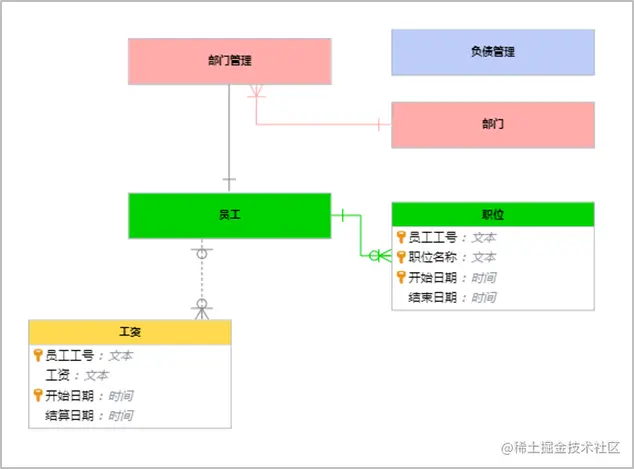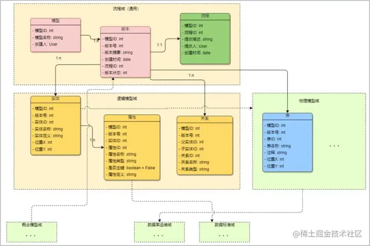 合理规划业务对象的关系、继承,实体包含属性、表包含字段、表包含索引、关系关联两个实体、ER图包含实体、关系等。确定聚合关系,实体头信息和属性列表构成实体、表头信息和字段列表+索引列表构成表、版本状态与流程构成版本化。接下来需要确定值对象,如字段类型、索引类型、操作动作类型等,最后领域模型验证需求,通过以上的流程我们实现了一个领域模型,如下图: