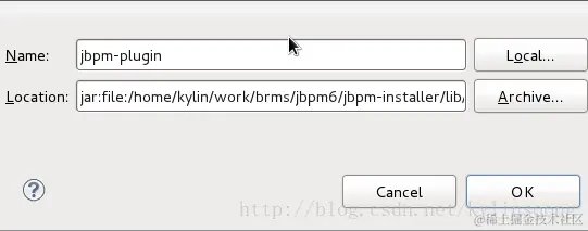 打开eclipse,Help -> Install New Software -> Add -> Archive,选择org.drools.updatesite-6.0.0.Final.zip,并命名jbpm-plugin(可任意名字)如下图: