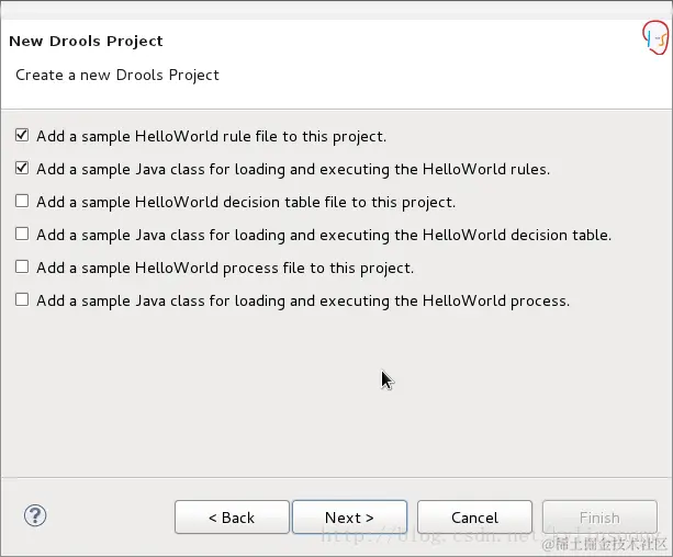打开eclipse,File -> New -> Other -> Drools -> Drools Project -> Next,创建工程名“org.drools.helloworld”,Next 确保HelloWorld规则文件和运行HelloWorld规则文件的程序被选中,如下图所示: