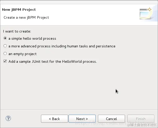 打开eclipse,File -> New -> Other -> jBPM -> jBPM Project(Maven) -> Next,创建工程名“org.jbpm.helloworld”,Next,确保简单示例流程模板被选择,如下图:\