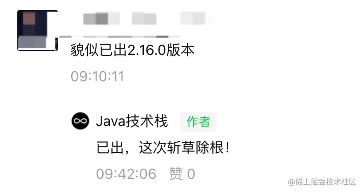 今天栈长打开公众号Java技术栈,又有粉丝留言说,2.16.0 发布了!!