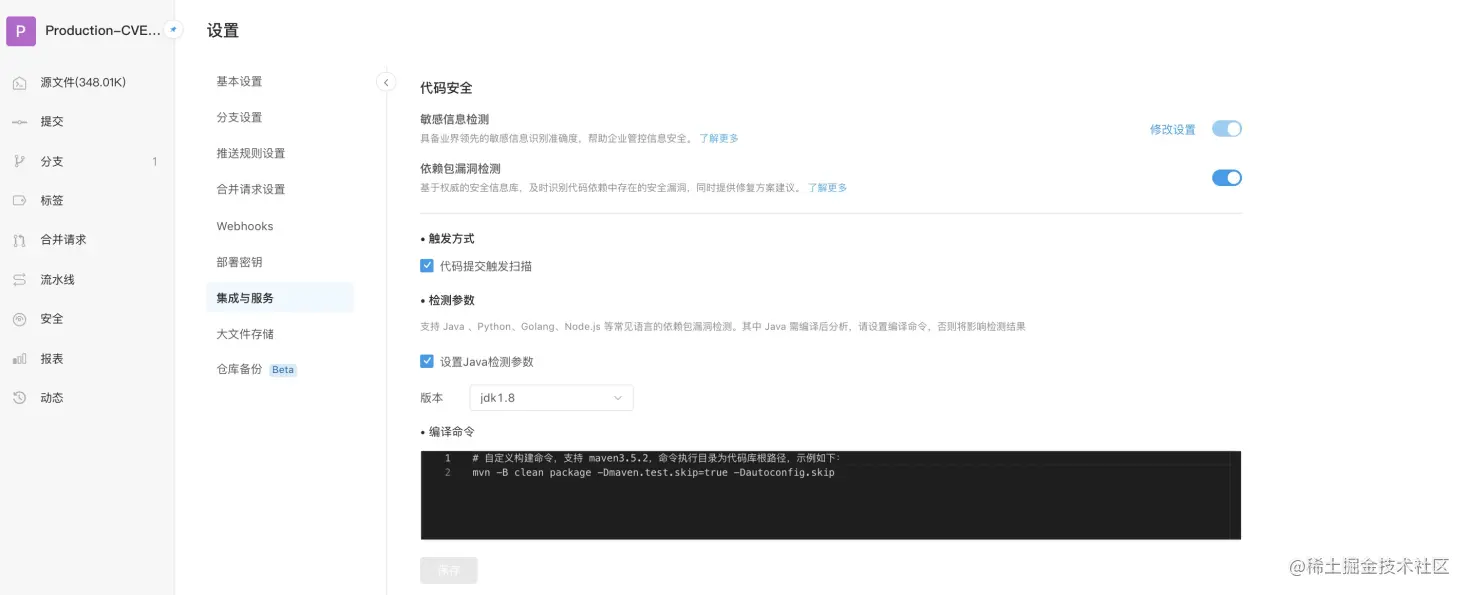 代码库管理员进入仓库设置-集成与服务中开启「依赖包漏洞检测」,请注意 Java 代码需要勾选「设置 Java 检测参数」: