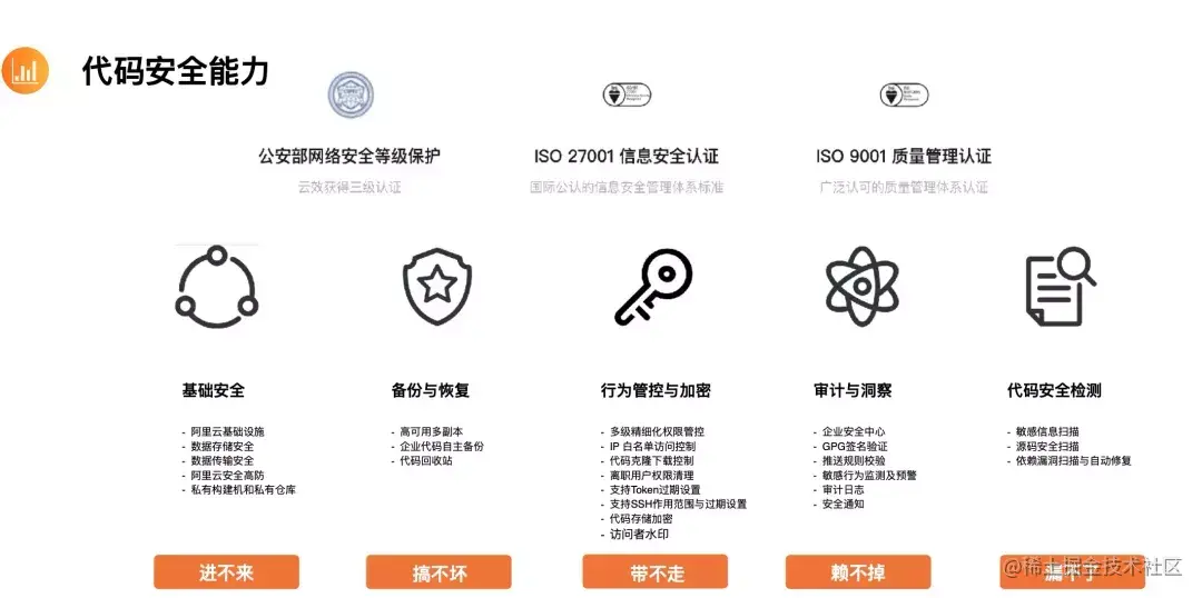 阿里云云效代码管理平台 Codeup 提供了丰富的安全服务,在访问安全、数据可信、审计风控、存储安全等角度全方位保障企业代码资产安全,如果你开始重视安全这件事,不妨立即前往云效 Codeup 开始探索。