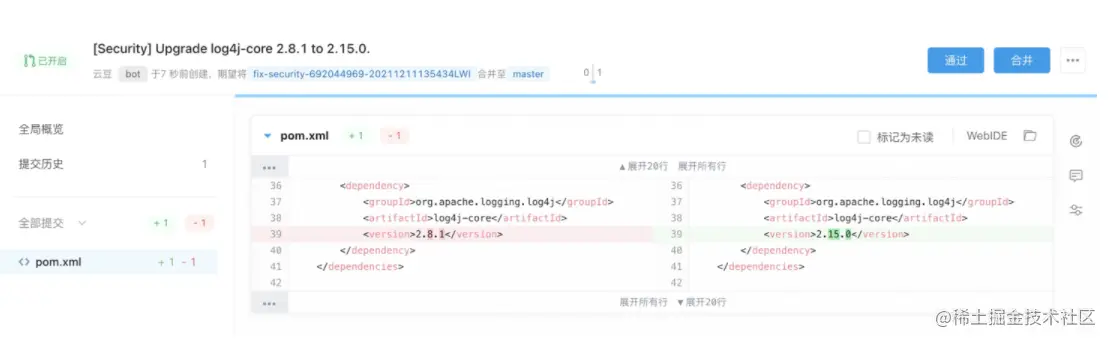 查看文件差异可以看到该合并请求已自动将代码 pom.xml 中的 Log4j 依赖版本升级到建议的安全版本: