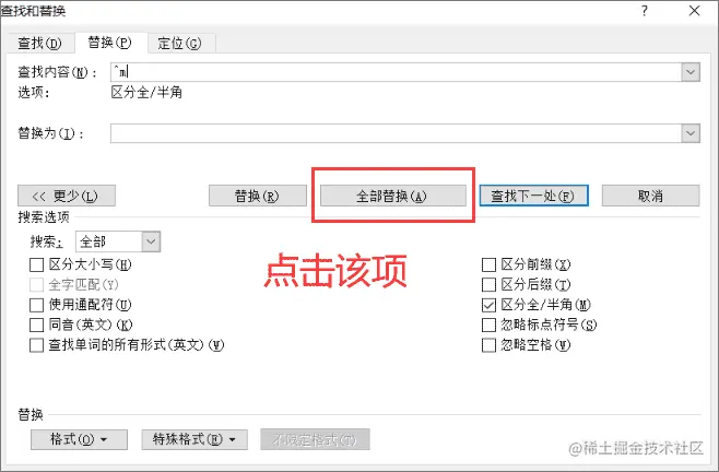 3.点击完成后,肉眼可见,查找内容处的框里出现了一个符号,这就是分页符,我们只需在界面中点击“全部替换”,空白页就会随风消逝。