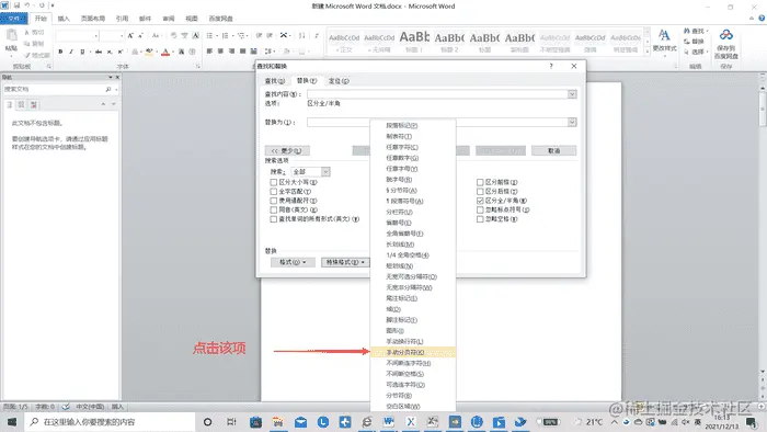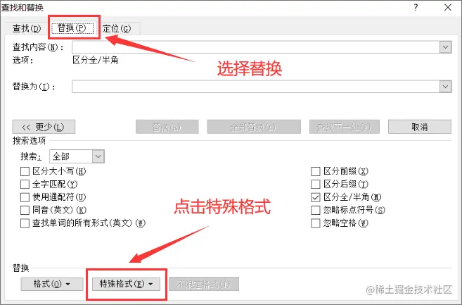 - 若是有多个空白页的话,不想龟速删除,我们该怎么办?可以采用查找替换的功能来实现批量性的删除。使用word的快捷键“Ctrl + H”打开【查找和替换】界面,点击替换下的“特殊格式”选项;