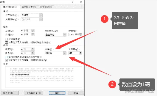 - 在“段落”对话框中将行距设为固定值,设置值设为1磅,最后点击确定即可完成删除。