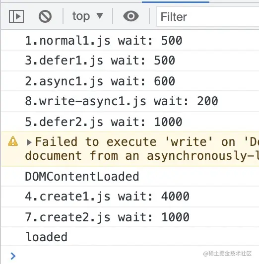 因为使用document.write写入的是普通的script标签,所以其也表现出了普通script标签的同步特性,阻塞了浏览器的继续解析,但是不会阻塞当前script标签内的代码执行,可以看上面的write end会先于2.write-normal1.js打印即可明白