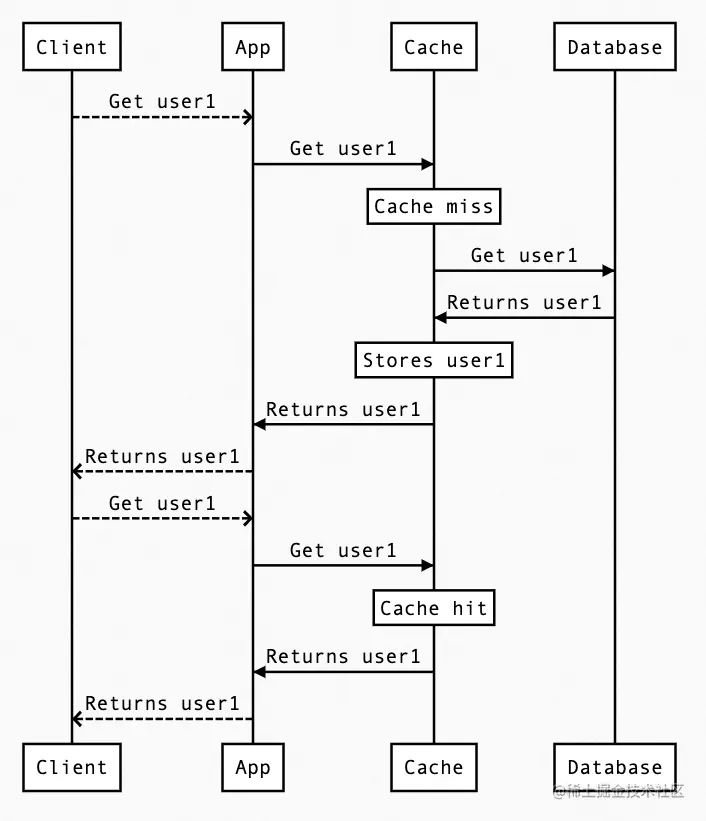 - 应用程序从未直接与数据库进行交互,而是始终与缓存交互。