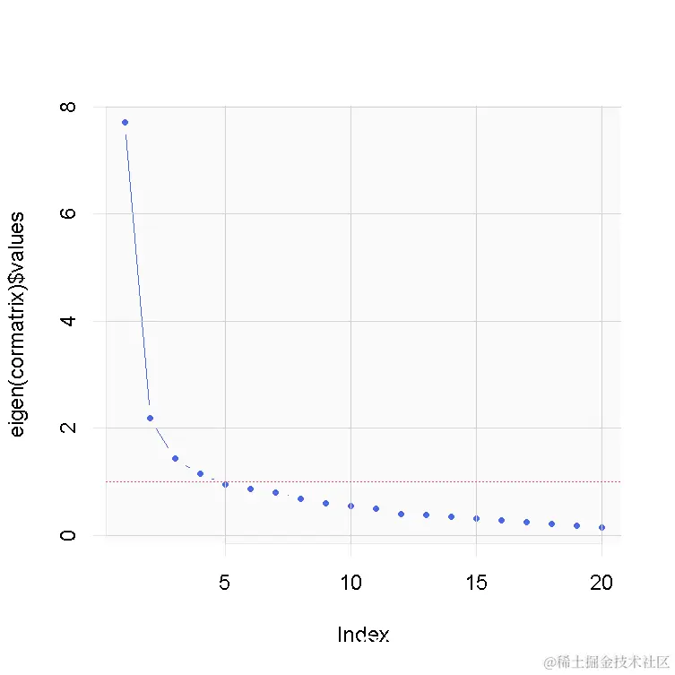 传统上,我们想用潜变量框架来描述上述20个项目,问题是:我们需要多少个潜变量来解释这20个项目之间的协方差?一个非常简单的方法是查看数据中各成分的特征值。
