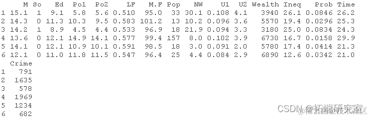 head(crim) #所有的变量都是预测因素,只有犯罪是因变量。