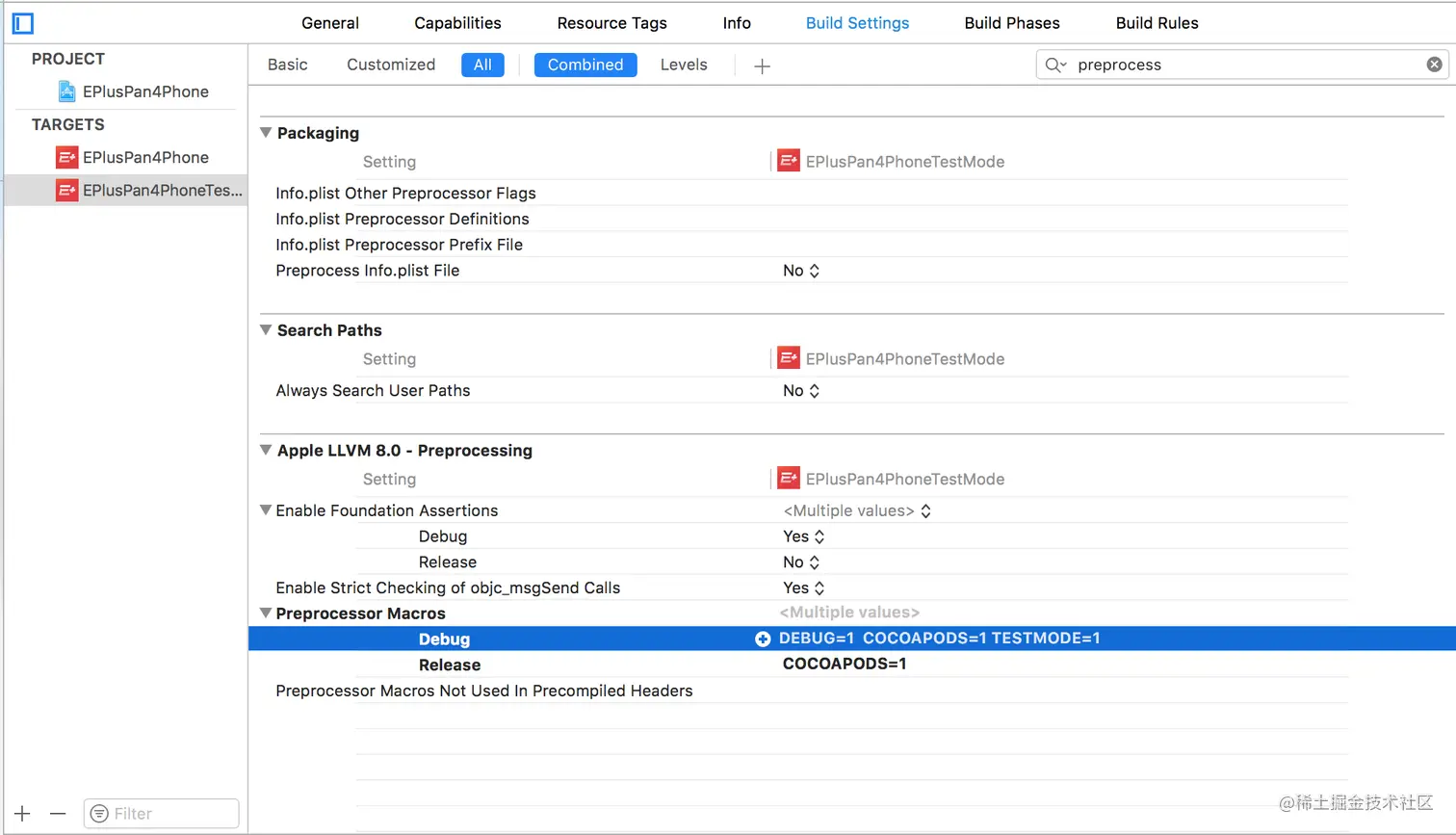 同样,我们同样也可以定义其他预处理变量,在XCode-选中Target-build settings中,搜索proprecess。然后点击图中蓝色的加号,可以分别为debug和release两种模式设置预处理宏。 比如我们加上:TestServer,表示在这个宏中的代码运行在测试服务器